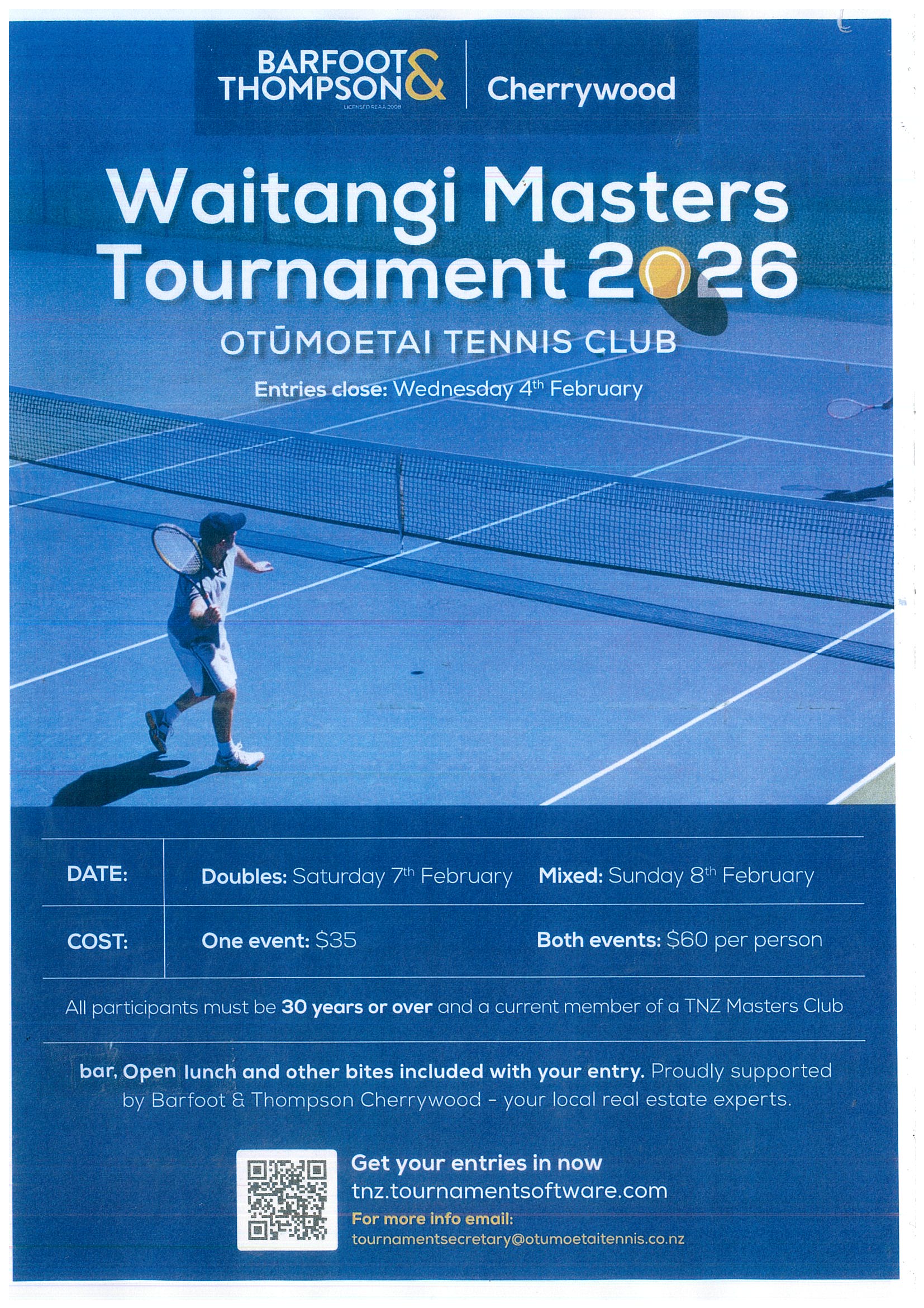 To enter a Seniors (Veterans) tournament all players must be members of a tennis club (eg Otumoetai Tennis Club) and also members of Tennis Seniors Western BOP (annual sub $20) or an equivalent Seniors branch. Minimum age is 30 although some tournaments have higher minimum age limits.